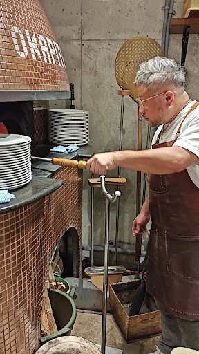到着してしばらく待ち時間がありましたが、期待を裏切らない活気ある雰囲気に、すでにテンションが上がります。 外観は控えめですが、店内は数席のテーブルとカウンターのある小さく温かな空間。 そして何よりも印象的なのが、奥に構える黄金に輝く大きなピザ窯。 まるで工芸品のような存在感で、この店がただのイタリアンでないことを物語っていました。