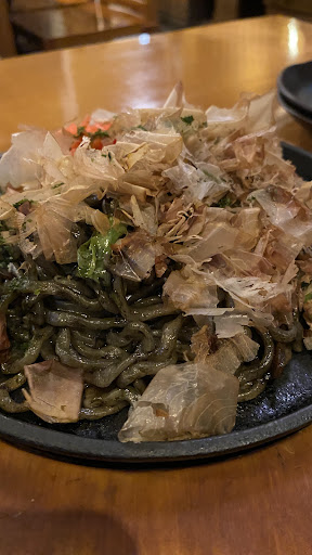 締めはもちろん名物の黒焼きそば。 熱々の鉄板で繰り出させる焼きそばに鰹節が踊る。 なんの黒なのかは不明だがコックリしていてうまい。