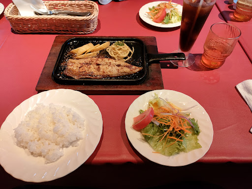 「豚肉の粒マスタード焼き」は、大きな豚肉、切りやすく食べやすいです。ポテトフライ、スパゲティがちょっとつくのも洋食レストランの乙です。