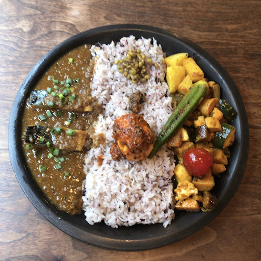 ここの野菜カレーはカレーソースのないドライタイプ。トルカリみたいですね。鯖カレーには切り身が2つで、カレーはグローブやコリアンダーシードがビシッと決まった香り高いスパイスカレー。ピリ辛スパイシーなカレーに鯖の甘さが際立って尚更美味しさを感じます。 ライスは雑穀米みたいなのでお聞きしたら、日本米の他に黒米、玄米とバスマティライスも混ぜていると。とても美味しいライスです。 野菜カレーはじゃがいも、ナスやズッキーニを中心にしてミニトマト一つとオクラが彩を添えます。少し酸味のある辛口カレー。ダルバートのトルカリみたいで美味しい。スパイス煮卵にはスパイスソースがかかっていてこの味も他のカレーやライスと素晴らしく合います。 かなり完成度の高いスパイスカレーに思いましたが、1100円とはリーズナブル。 食後にいただいた豆乳チャイもスパイスのトッピングが香りよく他では飲んだことのない美味しいチャイです。全体的にセンスが良くて落ち着く美味しいカレーカ...