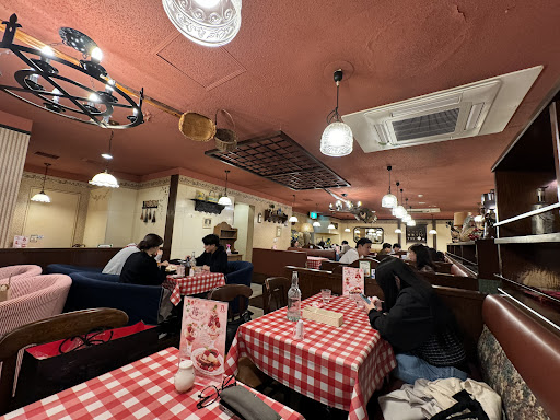 I tried this place out as I was searching for a decent omu rice place around Shinjuku. I felt the decor was a bit dated with the checkered red/white table cloths and floral pattern seats. I ordered the omu rice with spaghetti napolitan. The set came with a salad, corn soup and soft bun. Overall the service was responsive and quick. I felt the highlight was the soft bun which was served warm and well buttered. The texture was soft and chewy feel. It went well with the corn soup (which tasted like what you get at Saizeria). Spaghetti was topped with some slices of cheese (appreciate they didn’t use the canned powdered stuff). However, the cheese was a bit too thin and melted while I was eating the bread/soup. So the small slices kind of all stuck together. Spaghetti taste wise was ok but was a bit soft (overcooked). The egg on the omu rice was a bit too dry (felt like tamagoyaki texture) and the tomato rice inside seemed like it was prepared beforehand as it was lukewarm. I ordered the crème brûlée for dessert and the caramel layer was too thick (was hard to crack with the spoon) and the pudding was average. I give the bread a 4 stars but everything else seemed like 3 stars. Probably would not come here again for omu rice as it didn’t quite hit the spot and the other food items did...