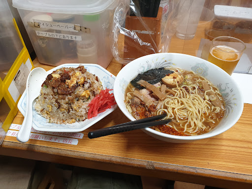 Read more美味しいチャーハンが食べたくて住んでいる近くでネットで検索。多々ある中でラーメンyaさんが気になるYouTubeにもでてくる。お昼丁度ぐらい、やはり並んでいる。7〜8人待ち?普段は並んでまで食べよーとは思わないがチャーハンがどうしても食べたい!スマホでゲームをやりながら待ち。先頭サラリーマン風3〜4人、お店の出入り口を塞いでお店のおばちゃんに注意される(笑)お客が出て行く手前で待ち客に注文を聞きに来るおばちゃん。先頭待ち付近にメニュー本が椅子の上に置いてある。ボクはチャーハン一本と決めていたのでメニュー本は一応みたが普通のチャーハンを注文。大盛りは1キロ弱とゆう事なのでビビってあえて普通にしました。店内では注文は原則しないシステムみたい。順番が来ると出入り口でおばちゃんが消毒スプレーでお出迎え。からの座席にエスコートされます。店内はけっして広いとは言えない。カウンター3席、4人掛けテーブル2卓。ソーシャルディスタンスの配慮がハンパない!ひと席ひと席アクリル板で仕切りテーブルにも。おばちゃん手作り?マスク売ってます。料理が出てくるまではマスク着用の張り紙。待ってる間はTVの音声と鍋を振る音…緊張する。 お待ちかね、チャーハン登場!とスープ。早速チャーハンといきたいがスープを一口。スープの色が味噌汁?味は中華風?豚骨?しっかり味で美味い!チャーハン、量はたぶん普通より多めかと?予想していた味を裏切っていなかった!個人の感想ですがまさに昭和の味!この味がいいんだよなぁ昔懐かしって感じ(涙)少々米は硬めでナルトが入りチャーシュー?見た目が美味い食べても美味しい!半分くらいたべたら大盛りいけるかぁ!?でも残り3分の1で無理かなぁ?と判断。腹いっぱいではなくボク的丁度いいくらいでした。最後にお会計をしおばちゃんにご馳走様!マスターにご馳走様して帰りました。久しぶりにスッキリした気分で食事をする事ができました。今度は違うメニューをいただきに行きます...