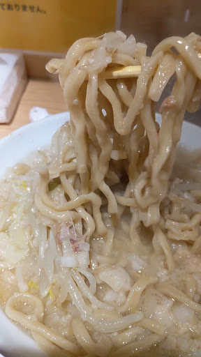 1回目。チャーシュー麺+大盛コールにんにく多め野菜多め玉ねぎ多め背脂多め味普通麺硬さ普通。ニンニクイレマスカ声掛けではなく食券譲渡時多めや硬めといった呪文系。優しい世界だと感じる。野菜はモヤキャベ対比8:2のシャキ+辛味を抜いた微塵玉ねぎのシャキ甘味仕様。玉ねぎのサッパリ感と食感は脂との相性抜群。麺は中太ストレート弱冠縮れのデフォで弱冠硬め。ワシワシではなく中々なモチモチ食感でスープリフトと味染み込み深度の麺単体の旨さはかなり秀逸。豚はバラ厚さ約5ミリの巨体。繊維が解ける柔らかさとトロトロ感。豚臭さの無しのしっかり下茹でしてからの味付け系。シャキ野菜脂サンドのダイレクトミル胡椒が活きる旨味爆弾。スープは微乳化のカネシ醤油か香味野菜系の甘味寄り仕様。塩分の角は立っているが野菜脂とのコラボで出汁のコクを感じられる。卓上に醤油ベースのカエシがあるので微調整はセルフで。麺のモチモチ感も相まって甘じょっぱいみたらし団子のしょっぱ寄り的なイメージ。二郎系としては麺量野菜量は凶暴ではなくデフォなスープの甘味でラーメンという体を外れていない。この麺の優秀さならガッツリ混ぜ混ぜする油そばともかなり相性が良い予感。令和の時代に二郎怖いと言って会話のネタにしたいノンアップデート情弱にわか勢がこのお店の丁寧な接客と爽やかさを味わってみればいいんじゃないかな。場所がらアキバ勢がファインドアウトして赴くかどうか絶妙な距離でどちらかというと神田リーマン勢ランチ飲み〆的な...