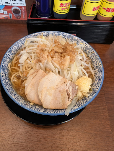 Read moreこの日は充填機の入れ替えで半休になり検索してて最近出来たと言うこちらへ行ってみる事にしました。 職場を車で10時過ぎに出て11時過ぎに到着。 店の先のコインパーキングが提携駐車場のようでしたがあいにく満車(汗) 周辺を探して空いていたコインパーキングに停めて訪問! 平日の11時過ぎなのに店内はほぼ満席! 券売機にて全てが完了するシステムは良いと思いました。 そして少なかったなぁと思っても後から個別注文出来るのも素晴らしいシステム! ラーメンの量を選ぶ→肉の枚数→その他のトッピング(有料)→無料トッピング→ヤサイ→アブラ→ニンニク等 多分この順番でポチポチとタッチ画面をポチッとしてお支払い。 自分は肉2枚→ヤサイ普通→ニンニクとアブラはマシでポチッと!するとレシートが出て来るのでそれを店員さんに渡すシステムです。 色々と呪文を唱えなくて良いので初心者にも優しいです。 辛うじて空いてた席に座り待ちます。 6〜7分程でカウンターに置かれますので下ろします。 見るとヤサイ普通だとやっぱり物足りなかったです。 ニンニクも入れたけど少なかったと思いました。 まぁ初訪なのでまずはこのまま頂きます。 ヤサイ少ないので減らさなくても天地返し出来ますね。 少し食べ進みニンニクが少なくパンチが足りないので追加!無料です。 ヤサイも追加しようか迷ったがスープが薄くなるのも嫌だったのでそのまま食べ進みます。 味はとてもバランス取れた二郎系のスープで旨いです。 麺も二郎系特有のゴワゴワ極太麺で硬めな茹で加減も良い! ただ肉は硬くて脂身も少なくて残念。自分的には肉がもっとホロホロで軟らかければ言う事無かったのだが… こちらはロットとかで提供しないので待ち時間も無くサッと食べられる二郎系で良いと思います。 ...