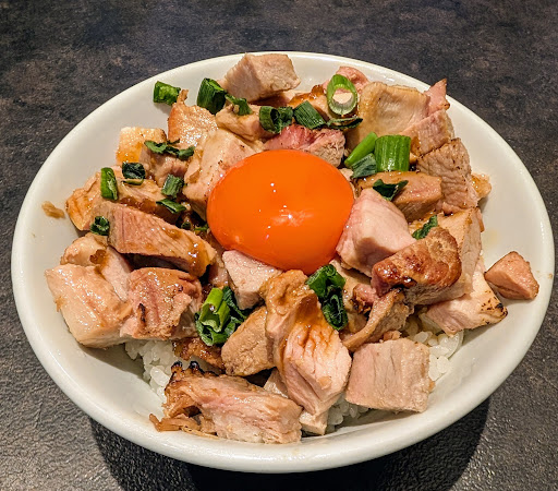 My meat bowl came out first, with raw egg yolk on top. Using my chopsticks broke the yolk and mixed it into the meat and dug in. The chashu had a very nice BBQ-like flavor to it and was really yummy. Less than 1 minute later, I was presented with my ramen. First tasted the soup which had a very pork boney creaminess to it and then a slight chicken-esque aftertaste creeps in. I can see how some people can say the taste is a little "gamey" but one could also say that is what makes it taste very "homey". The wide wavey noodles had a nice bite to it, like al-dente if you will, hence me choosing HARD as my option for the noodles. And then I tried a slice of the chashu, on the thin side and had a very delicate very delicious taste. The special version also comes with a seasoned egg that was perfectly seasoned and especially yummy. Highly recommend! I regret not ordering the LARGE upsize [大盛り] as my noodles ran out first. That didn't stop me from finishing every last drop of soup. I thoroughly enjoyed eating here and will definitely return back here once again. Thank you for a...