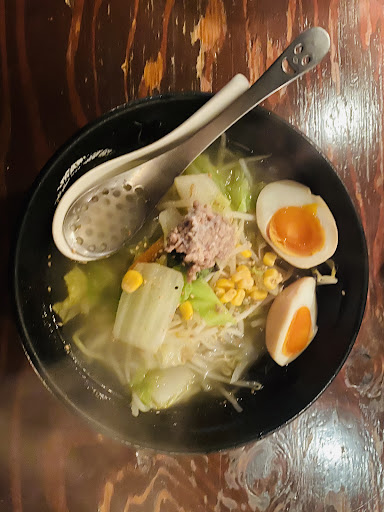 Ramen bar with counter seating, serving up bowls of noodle soup with sides of BBQ pork & dumplings.