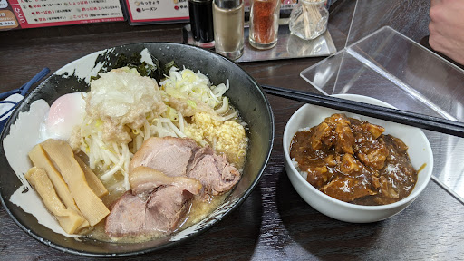 ラーメンの味と食材 このお店のメインは「二郎インスパイア系」のラーメンで、太めの麺に濃厚な豚骨スープがよく絡みます。スープは乳化したこってり系で、背脂とニンニクが効いた、まさにジャンキーな一杯です。チャーシューも厚みがあり、食べ応えが抜群。トッピングはお好みに応じて調整でき、特に野菜や背脂、ニンニクの量をカスタマイズできるのが魅力です。メニューはラーメン以外にも「豚骨カレー」や「まぜそば」など、豊富に揃っており、次回はカレーにも挑戦してみたいと思います。