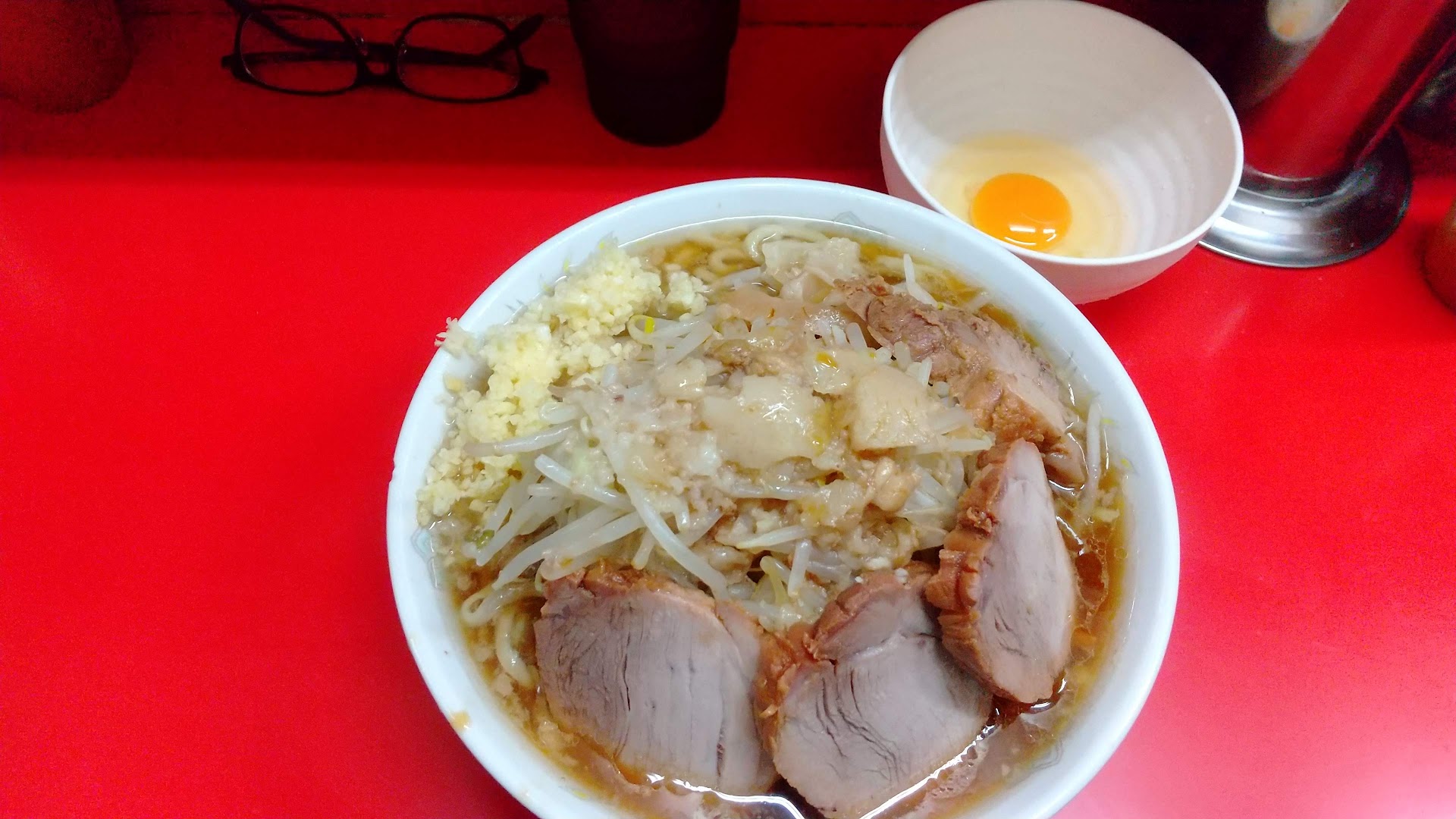 ・年明け二郎2軒目は上野毛。土曜日の13時前に到着。外待ち6名に接続。回転は変わらず良くて13:20には着丼。本日は豚切れだったので小ラーメンと生卵。トッピングは全部でニンニクマシマシで。まずはキレッキレのスープ。豚出汁感満載でカラメも効いて旨いなぁ。クタ気味の野菜にあぶらを絡めたり、豚と共に食したりと。本日もデロ麺最高。あぁー上野毛はぶれずに旨い。スープを完飲しそうなのを堪えて完食。今年も美味しい、ごちそうさまでした。 ・9月の最終土曜に久々の訪問。12:30着で待ち6名。ラッキー少かった。小豚と生卵を購入してまつこと10分程度で入店。直ぐに生卵が提供され7~8分でコールを聞かれニンニクマシマシ、野菜、あぶら、からめで。本日もビジュアルから文句無し。非乳化のスープを味わいあぶら野菜を食べつつ豚を喰らい食べ進める。デロ麺は本日も健在。旨すぎる。ボリューム満天だが無事に完食。本日も美味しかったです、ごちそうさまでした。 ・4月の最初の土曜日に年明け初の訪問。並びは外待ち9名。まぁ天気も良いので問題なし。時間にして11:15頃。着席は11:30過ぎ。流れは相変わらず良い。今日は小豚をチョイスし、麺量も普通。上野毛お決まりの生卵は当然。 トッピングはニンニク増し増し・アブラ・からめで。アブラは液体・固形と共に増される。液体アブラのお陰でスープは熱々に。本日もデロ麺に醤油がキレキレの非乳化スープが最高。生卵にアブラとニンニクを投入して麺と豚を絡めて食べる幸せ。 また来よう、美味しかったです、ごちそうさまでした。