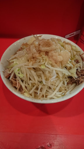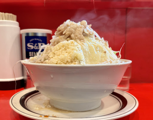 One of the better Jiro locations in my opinion. Very thick noodles and the soup is incredibly oily. The veggies make for a good combo to offset the fattyness of the soup. Extra garlic makes for a bit of a spicy ting. Incredibly good, but be prepared for a line if you come at peak hours (7-10pm)