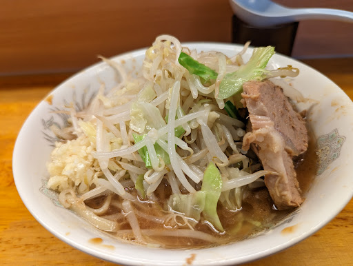 2024年12月再訪 日曜日の12時前に伺いました。並びは無し店内は8割ほど埋まっていました。 この日は「ラーメン(二郎の小)」を麺少なめでいただきました。 食券を購入し、席に案内されて座ります。食券を出す際に「麺少なめ」でお願いしました。 この日はコールをニンニクでお願いしました。