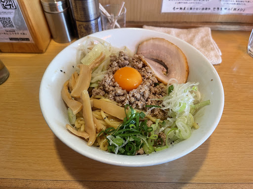 Read more今まで食べた汁なし系のラーメン(油そば・まぜそば)の中でぶっちぎりで1番美味い。 塩らーめんだったり醤油らーめんだったり他のも美味しいと評判だが、私は断然このまぜそば一択。 他の店舗には申し訳ないけど、正直どの汁なし系統を食べても、ここのまぜそばには敵わない。顔を見ただけで「まぜそば今日は売り切れです〜(笑)」と言われるほど通った時期もあった。それほど美味いのである。以下は食べに行ったときのルーティンを書かせてもらう。 着丼したらまずは「ニンニクください」と一言伝え、具材をかき分けて麺だけを一口。かえしのタレが濃厚、かといって重すぎることもなくちょうどいい。その間にニンニク到着、しかしまだ入れてはならない。チャーシューをひとかじりして、そして好きな具材と麺を一緒に食べる。ここでいう好きな具材というのは大抵はひき肉、メンマと麺を合わせて食べているが、気分によって変わるのであしからず。 この3つの動作ののちにようやく混ぜる。しっかりと混ぜて1口。「美味い。」その一言に尽きる。(なお、ニンニクはこの1口食べる前後に入れる。)美味いと同時に、「生きててよかった。」そんな言葉が思わずこぼれてにやけてしまうこともある。そう、既に口の中ではエデンの園が展開されている。それは口の中だけにとどまらず、食道を通って胃に到達するまで感じる。しかし、気がつくと目の前にあるのは空のラーメンどんぶり。そう、食べ終えているのだ。しかし私は感じている。まぜそばの香りが駆け抜ける口の中、まぜそばが運ばれた胃の中ではまだエデンの園が繰り広げていることを。そう、メタルギアでいうところのアウターヘブンである。入店から退店まで、終始幸せを噛み締めることが出来るここは本当の天国なのかもしれない。そして私は今日も強く生きる希望を持てる。 ああ、そうそう...