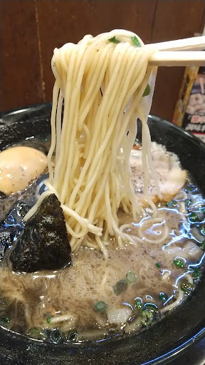 魚介豚骨にマー油、海苔と黒いナルト 煮卵チャーシュー紅ショウガ。見た目真っ黒。 九州ラーメン的な細麺に、魚介香るコクと後味に柔らかい甘味を感じる豚骨スープ。 完成度が素晴らしい。 チェーン系ラーメンでは、特に限定ラーメンは完全にナンバーワンの仕上がりです。 次回も期待してます。