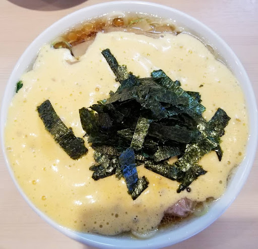 It is a soy sauce ramen with natto (fermented soybeans) on top.The natto is foamy and sticks to the noodles.