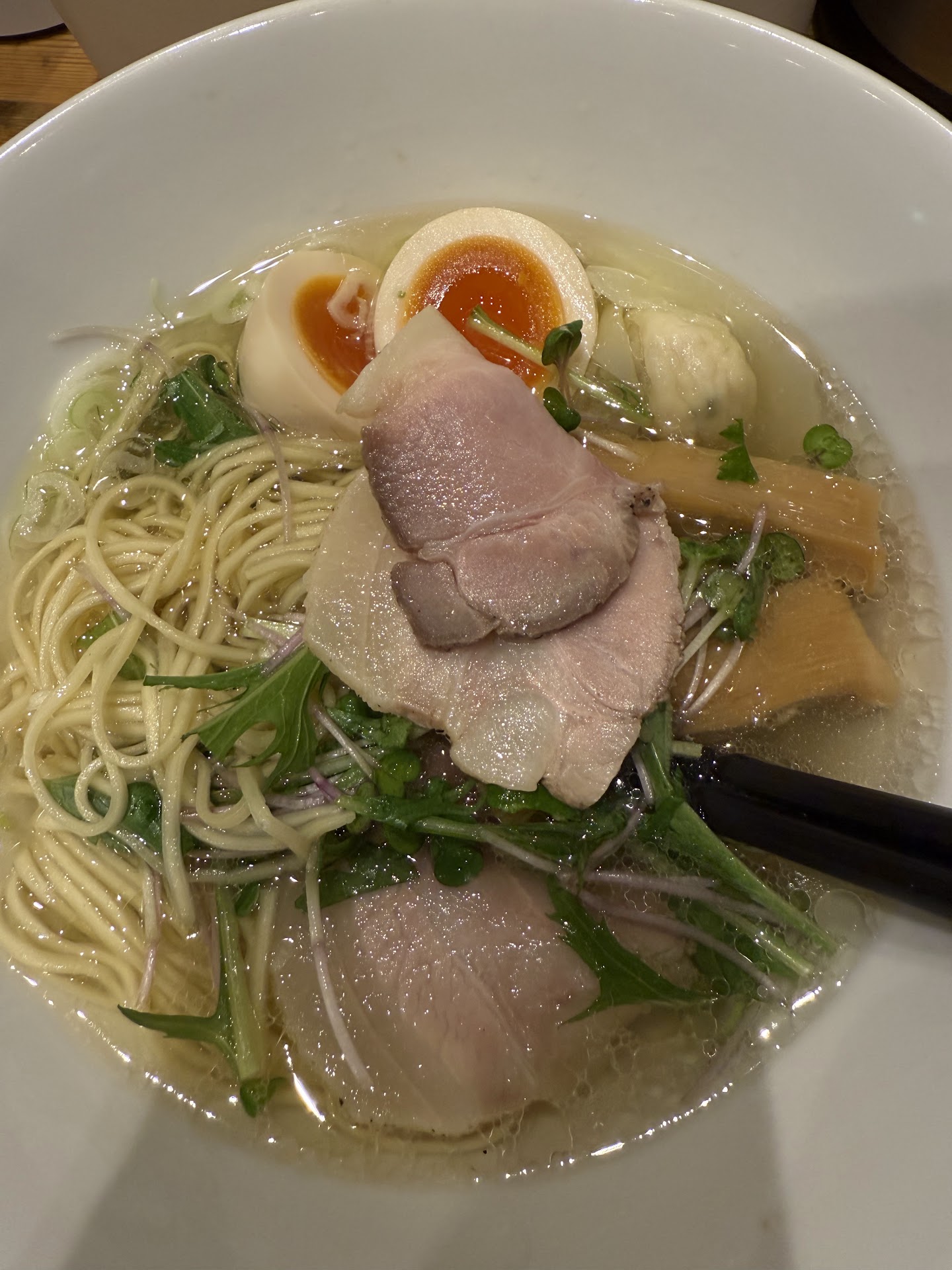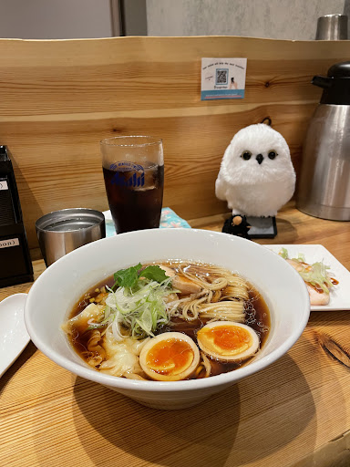 The broth is complex, rich, and has a lot going on. I can taste many different elements. A strong hint of ginger is there too, which complements the flavour well. It is rich but on the lighter side, not creamy but soupy. Slightly salty but not too overpowering from the soy sauce base. I believe it is quite well done. The presentation is wonderful, and garnished beautifully. The noodles are very thin and soften up nicely in the hot broth. Egg is cooked well although it lacks a marinade. The thinly sliced chashu is tasty as well and it even comes with soft wontons. The wonton filling is also complex with deep flavours and I can taste the herbs in there as well. Overall a very high quality ramen, with a decent price too (only ¥1,400). I...