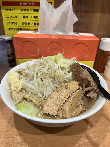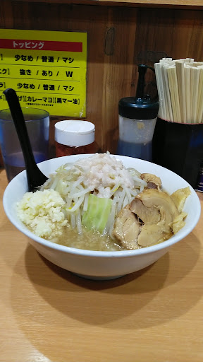 Read more秋葉原のお昼の飲食店は何処も混んでて、なかなかスムーズに食にありつけない。 そんな流れで、吉野家、かつや、日高屋が行列で溢れていた為、店の前を通過して裏路地へ。 道沿いに歩いて行くとらーめん忍者なる黄色い看板が! これは二郎系とお店の様子を伺うと、やはり二郎系のお店でなかなか美味しそう。 ただこの日は列が店外に出来てたので、また後日訪問とこの日は撤退。 そして後日訪問して来ました。 まず入口左にある食券機で食券を購入となるが、新札が対応していないので、新札の両替をお店のスタッフへ依頼して旧札へしてもらい早速食券購入。 二郎系らーめんの普通950円で茹で前の麺量が250g、大盛が375g、特盛が500g、もち少食の私は普通を選択。 世間の直系二郎や二郎系と比べるとやや少なめだが、私には十分。 カウンターはL字の8席で背もたれがある椅子なので荷物や上着を椅子にかけれる。 カウンター下の荷だなもあるので荷物を置ける。 水は入口入ってすぐ左に給水機があり給水機の上にコップがある。 れんげとティッシュは席の前に個別に複数置かれている。 席に着いたらカウンターへ食券を提出、スタッフから数分後にトッピングを聞かれるので、ニンニク、野菜、アブラ、味の濃さをこのタイミングでコールする。 さらに追加でマヨネーズや黒マヨネーズのトッピングもあり。 私はニンニク普通のアブラマシをコール。 待つこと約7分くらいで着丼。 さっそくスープを一口。 乳化系の味にキレがあるスープで美味しい。 次に豚を食べる。ホロ豚でやわらかく、すぐに崩れる柔らかさ。 味は豚にしっかり味が染みてるのは嬉しいが、微妙に焦げっぽい私個人的に嫌いな味付けを感じ残念な豚と言う印象。 次に野菜をかき分け麺を啜る硬くも柔らかくもない適度な茹で加減でつるつるな噛みごたえのある喉ごし良い麺。 そして最後のチェックはアブラ野菜を食べる。しゃきしゃき野菜で口の中がリフレッシュ! やはり個人的に野菜はしゃきしゃきな食感が箸が進む美味しさ。 一気に食べ進め、麺が半分くらいになったら味変のニンニクをスープに混ぜ、パンチの効いたスープに変化してこれがまたかなり美味しい。 そして約15分程度で完食。 まずまずの美味しいさに満足しました。 ですが豚の味付けが個人的に気になりました。 それと券売機が新札が対応してないのは サービスとして不便ですね。。 野菜の盛りはかなり豪快なので野菜マシでかなりの標高になります。 味がツボ入...