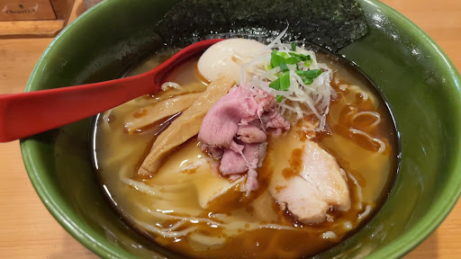 FOOD: Special Niboshi Soy Sauce Ramen - $9.00 The broth had a dirty color with a medium intensity bonito flavor and slight fishiness. Bits of tempura, whole gooey egg, nori, raw onion, bamboo & chashu topped the bowl. Noodles were good; thicker, wavy and al dente. I spooned in some of the rice cracker balls from the condiments which gave the bowl some crunch, but I wouldnโt do it again.