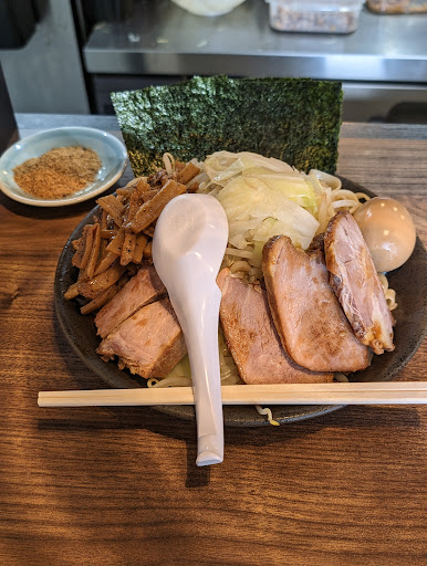 Great thick noodle tsukemen available. As the amount is huge though normal/ nami ïŒäžŠïŒ for me ïŒMaybe 250g or moreïŒ, I shouldn't order any others like a gyoza/ dumpling. As the oil was covered with the soup, very hot taste kept on, but the serving time took over 15mins I think (As too thick noodle, maybeïŒ. Taste was so so. Well... I wish it could be full bodied. Might be just too oily, but light for me.