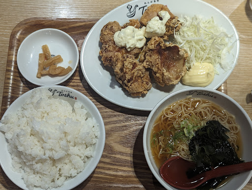 人数より明らかに多い注文をしてしまったのですが、こちらの店員さんの提供タイミングがプロすぎて驚きと感動でした...! 全てを温かい温度でいただけました。 あい盛り定食のチキン南蛮は、タルタルはオリジンの小袋で来ると思いきや、たっぷりのタルタルがかかってきました! あい盛りの名前の通り、チキン南蛮と唐揚げが2つずつ、唐揚げ自体は同じもので南蛮ソースとタルタルをかけています。唐揚げにもマヨネーズが添えてあり、最高のカロリー爆弾です♪ 唐揚げのサイズも大きい!大満足サイズです! ラーメンは魚介系のスープで、脂っけは無い感じです。