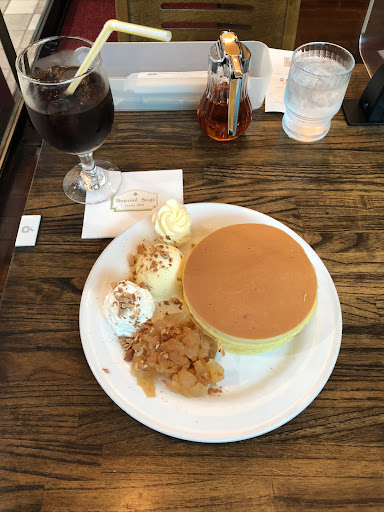 ホットケーキは、季節限定のシナモンアップルにしました。 外側がカリッとして中は、しっとりともっそりの間、という正しく美味しいホットケーキでした。マーガリンの塩味とメイプルシロップかけて食べるのがサイコーに美味しかったです!