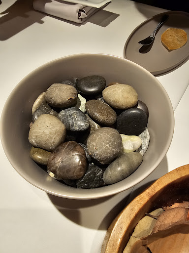 ♦︎ 小石と葉 本物そっくりな小石と葉っぱの形をした一口アミューズ。探しながら食べるのも楽しい☺️ 小石は竹炭を練り込んだ豚リエット 葉っぱはノンフライポテト 本物の小石と葉っぱと見分けがつかないくらいでした