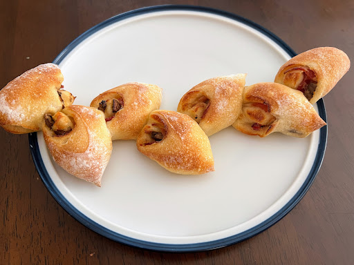 ぶどう&チーズは、モチッとした生地にブドウとクリームチーズがよく合います。羊乳から作られ、世界三大ブルーチーズの一つとされるロックフォールを使用した「ロックフォール」もモチモチ系。甘いリンゴのジャムと合うのですが、ブルーチーズの臭みがあるので好き嫌いは分かれそう。