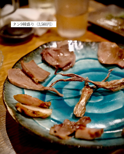 「タン9種盛り」は牛・豚・ラム・馬・鯨・ワニ・鴨・鹿・猪 数量限定セット。正直どこのだれさんと言われても効きタンは不可能なぐらいには、大差なくおいしく食べられる。鯨の食感が良かったのと、鹿の脂がおいしかったのが印象的。