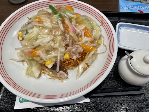まあ自分は麺パリパリの皿うどん派である。 このスナックの様なパリパリを餡とからめてザクザク食べる。 後半はしんなりしてきた麺をたまに酢をかけては餡ごと豪快にずぞぞと啜る。味覚食感味変と申し分ない。これだけの満足感だが野菜も取れているので栄養価でも文句なしである。1人でも入りやすく、お値段もリーズナブルなので、...