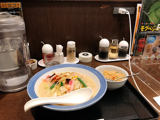 Read more初訪問。木曜日の14:00頃伺い、待つことなく座れました。時間帯のせいか店内はガラガラ。 頼んだのは長崎ちゃんぽんの半チャーハンセット。ちゃんぽんは安定して美味しいですね。チャーハンは初めて食べましたがこれも普通に美味しかったです。すぐ冷めてしまうのが難点ですが。意外とちゃんぽんの量が多いので半チャーハンでもお腹いっぱいになります。 店内は少し広くて40席ほどあります。テーブルの上に店員を呼ぶベルなどが置いてあって便利です。荷物カゴあります。壁際のカウンター席10席くらい?に電源があるのと、店の外に長崎ちゃんぽんなどの冷凍食品の自販機があることには驚きました。そんな店舗もあるんですね。店員の接客は普通に良かったです。他と比べてそこそこ清潔感のある店舗だと思います。 コロナ禍で経営赤字になり店舗を大幅に縮小したと聞いたので、応援のため行く頻度...