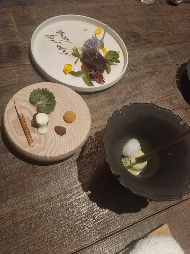 In general, all the food was tasty, the place is quiet and atmospheric, I really liked a small number of seats. But there were several serious disadvantages: The check came out much more than our expectations, there were many positions incomprehensible for us, the glass of wine instead of 1000 ¥ on the menu went out at 1800 ¥ The waiter spoke badly in English, so it was difficult to communicate and we didn't find out why the price was higher All the sweets, except for the ice cream, were completely tasteless The waiter asked what country we're from, and then, when we left, it said goodbye in French, but we are not French and completely different country. It...