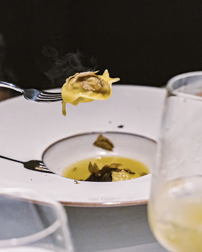 ・香りを包み込んだラヴィオリ"トルテッリーニ" × オレンジワイン トリュフの香りと滋味深い出汁が特徴のラヴィオリに、フリウラーノ100%のオレンジワイン「ネカイ」を合わせたペアリング。単体では甘味のあるワインが、料理と合わせると絶妙な青っぽさを感じさせ、最後の余韻まで感動的でした。