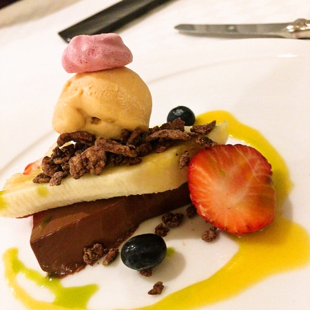 本日のデザート チョコレートがふんだんに使われていて、チョコプリンやアイスもとろとろ、ザクザクの生チョコレートの食感は、何回口に運んでも面白い演出でした! デザートでこんなに食を楽しめるって嬉しいです^ ^