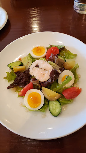 足りないものが何もない良い店です。唯一足りないのはGoogleで付けられる星の数でしょうか。5つでは足りません。金曜日の13:00頃、予約なしで伺いました。 東村山駅を出て志村けんの木の方面へ歩いてから徒歩2分、何もなさそうな路地を抜けると左手側にこの店はあります。 掲げられた看板にある文字には“BRASSERIE LA RIVIÈRE D’OR゛とあり、訳すと「定食゛黄金の流れるところ゛」といったところでしょうか。 残念、店主さんの苗字が金川だそうです。 住居兼店舗の建物のようで、良い天気だったので2階のベランダには洗濯物が干してあり、なんとなく宮崎駿の世界観を感じるような、程よく生活感が出ている気取り過ぎていない店構えです。 ガラスの扉を手前に開けて店内に入ると、数人のマダムが談笑しながらランチタイムを楽しんでいます。程なくして奥の方から調理服姿の方が出てきて席に案内されます。1人であることを伝えると2人掛けの席に通され、メニューを手渡すと同時に、さり気なくセットされていたナプキンを1名分下げていきました。 メニューを見終わったころに同じ方がやってきて、オーダーテイクをしてきます。元から安い方のランチコースを頼むつもりだったので、コースの用意ができるか確認すると快諾され、お肉のメインはサーロインステーキ、お魚は帆立貝となっている旨説明がありました。ワインを頼めるのであれば迷わずサーロインに飛びついて赤ワインをお願いしたでしょうが、緊急事態宣言下にあってはドリンクの提供ができないこともあり、お魚のコースをお願いしました。