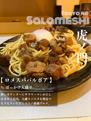 しかし問題はある。ハングリータイガーだ。並ぶ。必ず並ぶ。もうね、あれは店じゃない。並ぶという儀式を強要する宗教施設かなんかだ。というわけで、信仰心が足りないボクは、ロメスパバルボアへと足を向けた。ここはね、ジャポネ式のパスタ、つまり“炒める”系。ジャンクで炭水化物に油と塩分と少しの背徳感をまぶして炒める、理性のカーボンコピー。