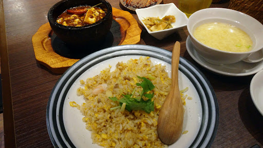 JR青梅線は昭島駅の北口、モリタウンの一角にお店がございます。 ちょいと昭島で用足しがありまして、その途中お昼でお立ち寄り。 チャーハンと麻婆豆腐がセットのランチで、チャーハンの種類が選べるとあります。 4種類の中から、いちばんオーソドックスな揚州チャーハンにいたします。 麻婆豆腐の辛さも選べましたがこれは普通で。 まわりはなかなかの混みっぷり。人気の様子にございます。 さてチャーハンランチ。 平皿にふわっと盛られたチャーハンは、見た目よりボリュームあり。 ちゃんと中華鍋で煽ってありますので、ほどよくパラパラのご立派チャーハンです。 お次は麻婆豆腐。 小振りながら、石焼の器の中でグツグツしております。 辛さ普通でもバッチリ山椒が効いた本格派。 辛いものが得意でないなら、あまり冒険しない方がよろしいかと存じます。 玉子スープとザーサイも付いてこのクオリティなら、お昼ごはんとしては贅沢な部類のご立派...