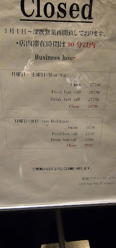 We've been treated like royalty here in Tokyo every time, and because of that, we had high hopes for Granbell rooftop bar too. We checked, that because of national holiday, food was served until 21.30, and drinks until 22.00. We came in, and the terrace was full, and we were asked to wait inside. People from 2 tables left, and the tables were cleaned, but no one came to tell us, it was our time to go outside, until, we went, and asked ourselves. Even then, the waiters seemed to be confused, if we could go out to the terrace or not. It was about 21.10, when they finally came to take our order. Then the waiter just told us, that we couldn't order from the food menu anymore. We were surprised, but ordered drinks then. Cocktails were good. But after the first cocktails, we were invisible again. We pushed the call button on the table, and tried to get the waiters to notice us. Not a chance! Just before 22.00, we finally got to order our 2nd cocktails. The we noticed, that the hotel customers got to order food even then. Then it was the waiting game to get the bill!! We pushed the button several times!! Finally paid and left.
