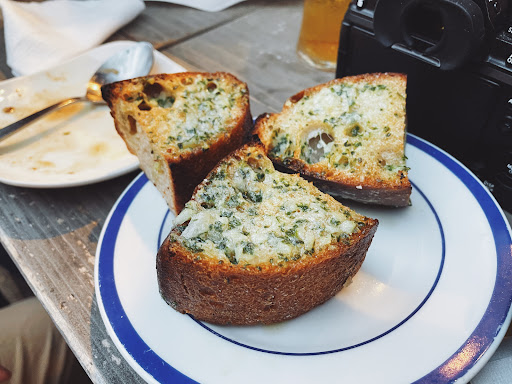 We started off with the garlic bread, and it was definitely a highlight of our meal. We paired this with a glass of red wine, and it was the perfect start!