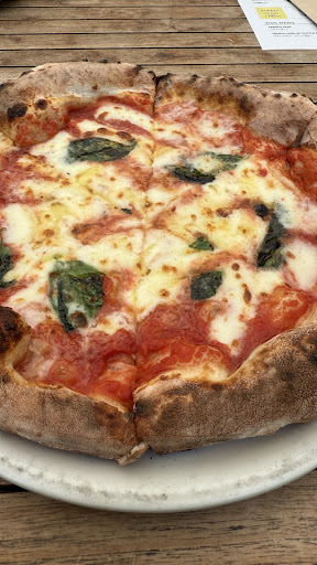 Barbecued meats & wood-fired pizza served on a laid-back outdoor patio with twinkling night lights.