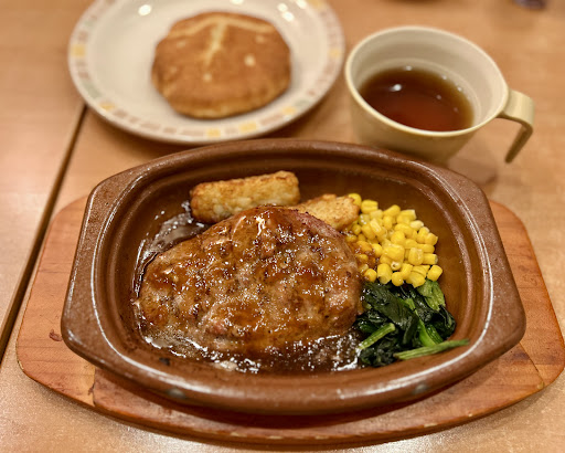 Seeing how cheap things were, I went all out. Getting the Pea/Egg dish, Hashbrowns, Hamburg Steak, focaccia bread, unlimited drinks and double dessert.