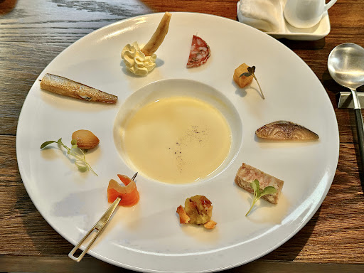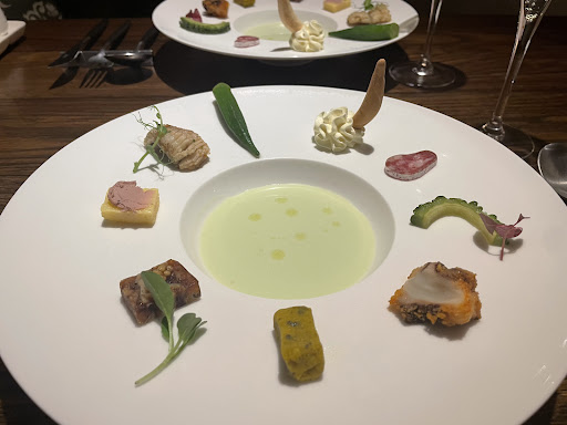 コース始まりのお料理でしたが、 見た目も可愛らしく、どれも1口サイズで 10種類の色々な味を楽しむことができ、 次に出てくるコース料理への 期待が高まるようでした。 どれから食べようかとても迷うほどでした。