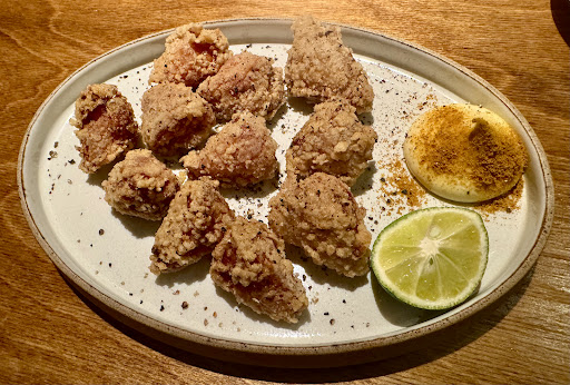 ⬛︎ぼんじりの唐揚げ 980円 徳島地鶏の阿波尾鶏を利用したこちら 揚げ物と油っぽいぼんじりの組み合わせでもくどさは無く美味しく頂くます こちらも付属のスダチと一味マヨネーズとの相性◎ ジューシーな肉汁と相まって、 すだちサワーもどんどん進んじゃいます