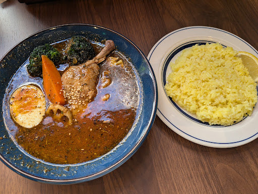 スープカレーはあまり食べたことがなかったのですが、揚げナスがジューシー、チキンがホロホロしていて大変おいしかったです。ごはんの量は選べますが女性は150gでちょうどいいと思います。中辛は辛さ控えめで、備え付けのスパイスで調節すると好みの辛さになります。カウンター席に案内されましたが、両隣にダウンを着た大柄な男性がいらっしゃったのと、スープカレーの食べ方の性質上前屈みになるので、ほかのカウンター席のお店より狭い印象でした。 店内のBGMがとても大きめで、昔の音楽が流れているので自分のイヤホンを持って行って対策した方がいいです。