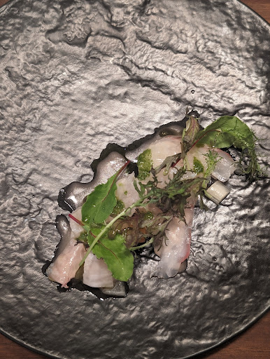 まずはビール小瓶(???円 ※メモ忘れです)を頂き、前菜3種類から選んだ、平目カルパッチョと頂きます。 見た目が美しい。 これが第一印象です。 身の部分とエンガワもいます。 特に身の部分のモッチリ感が素晴らしく美味しい。 更に、色々野菜のピクルスとの相性も抜群で最高に美味しいです。 お酒が進むので白ワイン(???円 ※メモ忘れです)も頂きます。