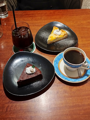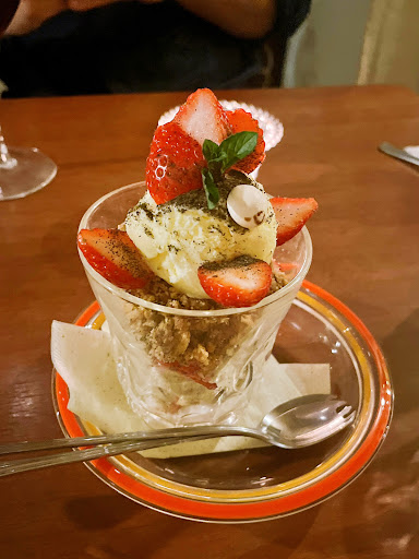 Small, cozy, dim cafe. Full but not too full on a Wednesday night. Cafe latte art was cute with a kitty on top at ¥750. Strawberry/hojicha flavored parfait just tasted so-so at ¥950 for what it was with some strawberries, ice cream and sponge cake. Things were all a bit expensive but not bad for a quick visit with a friend if you’re nearby. There’s also a corner selling some...