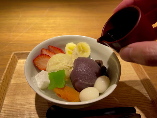 餡は昔ながらの製法を大切にし、熟練した職人が温度や季節を考慮しながら日々炊き上げている。すっきりした自然な甘さであずき本来の美味しさが際立つ。黒蜜は種子島産の黒糖を使っていて、こちらも優しい甘さが寒天や餡にぴったり。白玉も注文を受けてから茹でるので、ツルッとした舌触りとモチモチの噛み応え。