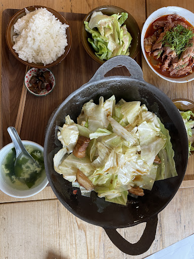 Meandered in for lunch one day after a close friend raved about the quality of the food. There were four lunch sets on the menu for that day: a spicy mutton tofu noodle dish, a cabbage pork stir fry, a lamb soup, and a forgotten fourth option. The mutton was subtle in taste but deliciously spicy. The pork cabbage stir fry was definitely the tastier of the two dishes. The restaurant was spacious and offered good views of the area. The server was distant and seemed discontented with life...
