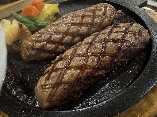 今回は初めての利用でしたので、一押しっぽいハンバーグ300gのセットを注文しました。ハンバーグや付け合わせの他にスープやライスかパン、ドリンクがついています。ソースは10種類もあって迷ってしまいますが、多めに提供してくださるようでしたので、グループで行く際にはそれぞれ違うソースを頼んでシェアしても良いかと思いました。 提供される際には俵型のハンバーグを鉄板のままテーブルに運び、客の前で半分に割いて中央から焼きを入れながらソースをかけて提供してくれます。まず、味についてですがハンバーグとしてはちゃんとしていてかなり美味しいと思います。なお今回はレアでお願いしましたが、ミンチにされたレア肉のねっとりした感覚が口に広がり、私の好みとしてはミディアムやウェルダンの方が美味しそうに感じました。