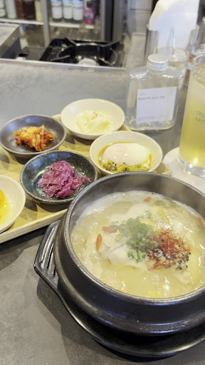 メニューはなんと参鶏湯1種類のみ‼️ ▫️ 超濃厚日本的参鶏湯 濃厚な鶏白湯と薬膳の絶妙なバランスを叶えた、 白菜キムチ、もやしナムル、長ネギのヴィネグレット、紫キャベツのシャークルート、韓国風温たま、キャロットラペの 6種類のおかずが付いていてボリュームも満点💯 オーダー時にライスも付けるか選択できたよっ💕