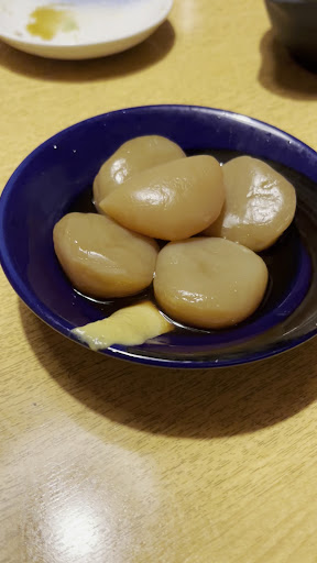 まずは生ビールで乾杯し、きゅうり一本漬けと玉こんにゃくで舌をならす。 じっくり味の染みた玉こんにゃくは、どこか懐かしさを感じる一品。