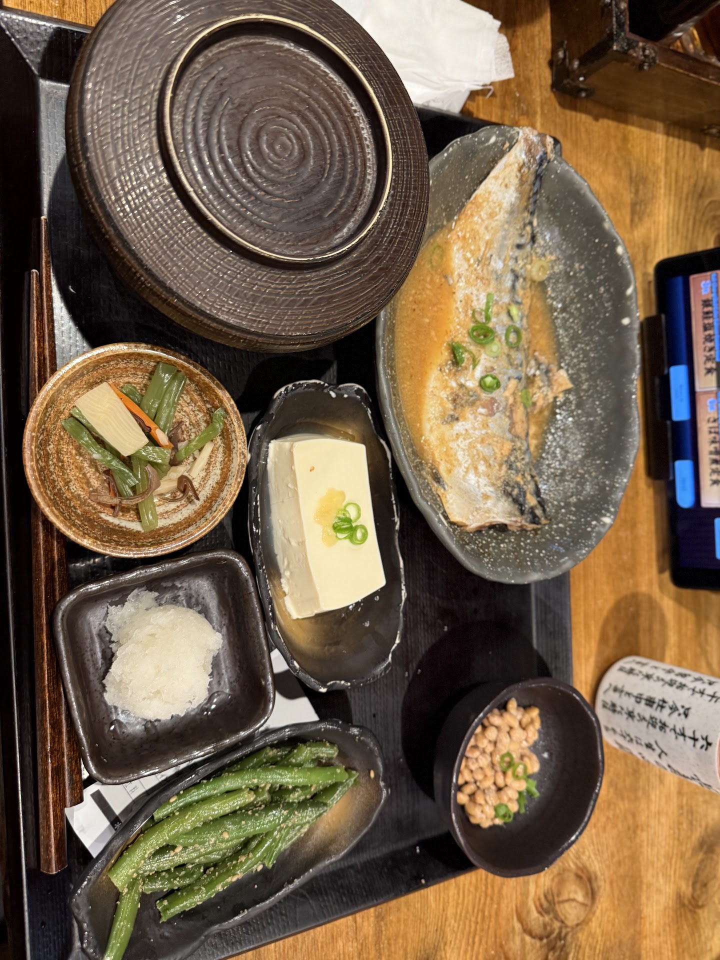 I went with the miso mackerel with green beans, tofu, and nato added on. The mackerel was flavorful and cooked well. The sides were just the right portion as to not overeat but to allow you to try a little bit of everything.