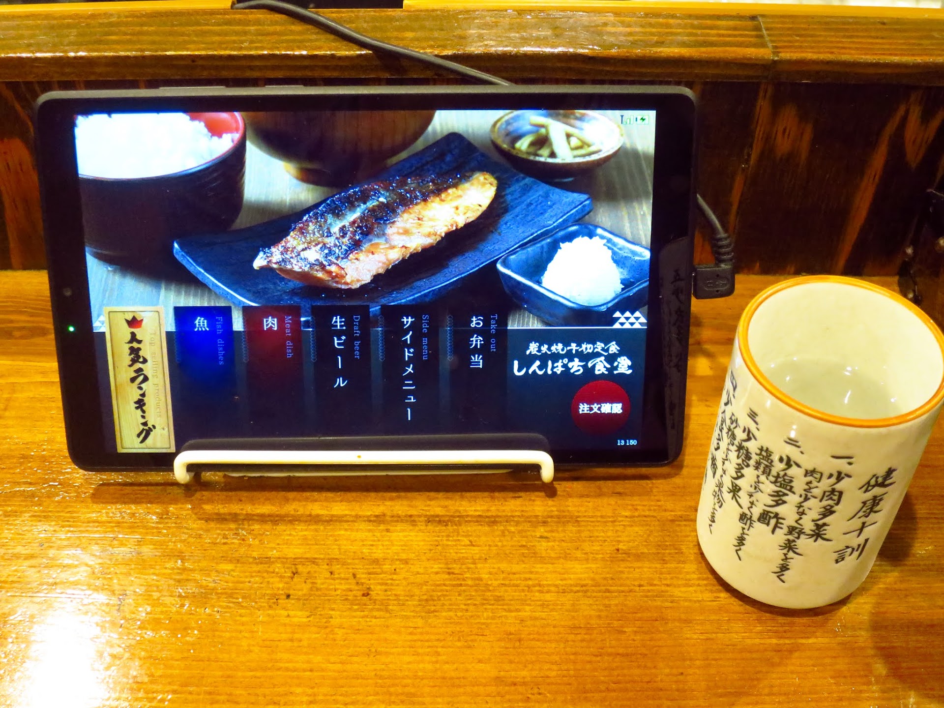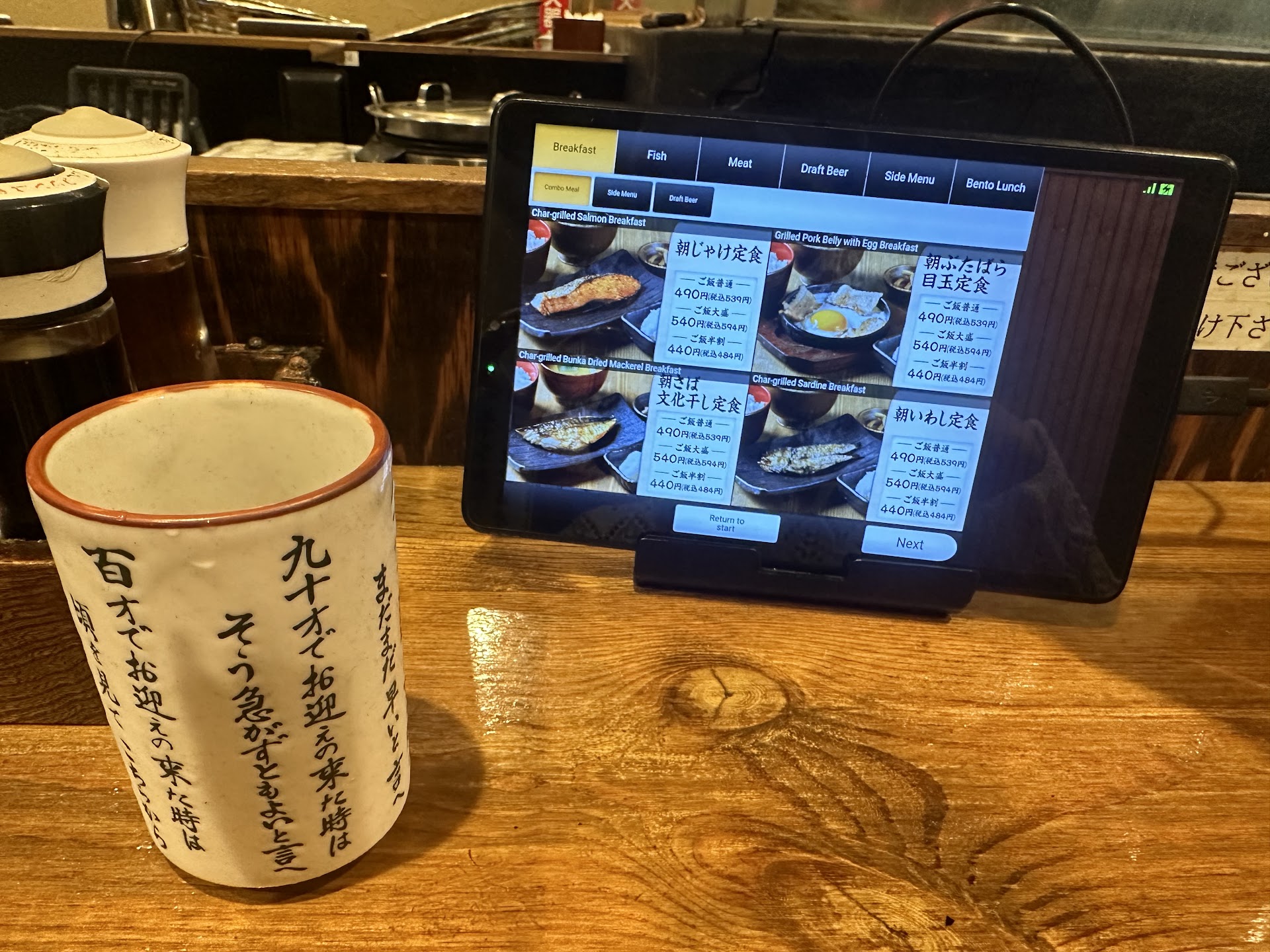 The menu is structured where you can order your main entree and add on sides for about 60-100 yen each. The main entree usually comes with a fish dish, miso soup, radish, and rice. Additionally, you have the option to do a larger portion of rice or a half size. You order on a tablet which has english menus.
